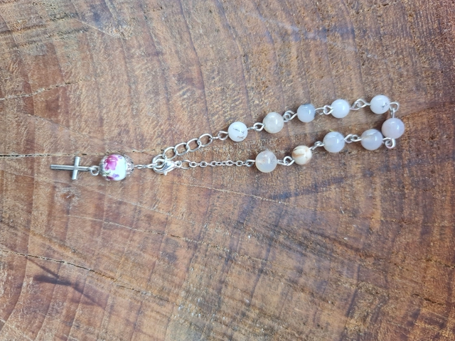 Dizainier de fabrication artisanal en acier inoxydable et pierres naturelles d'Agate Rosé, aide à être optimiste et prendre la vie du bon coté, aide à solutionner les problèmes affectifs et mieux comprendre les soucis du couple. Vendu avec sa pochette d'organza.
